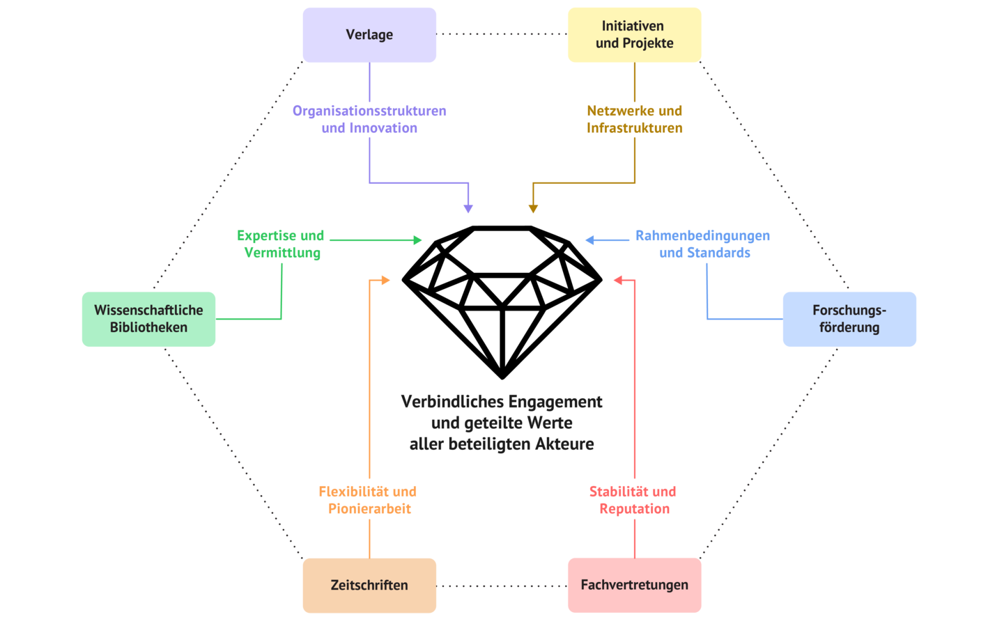 Akteure der Diamond-Open-Access-Community: Sechs Akteursgruppen und ihre individuellen Beiträge zu einem fairen und gemeinschaftlichen Diamond Open Access.