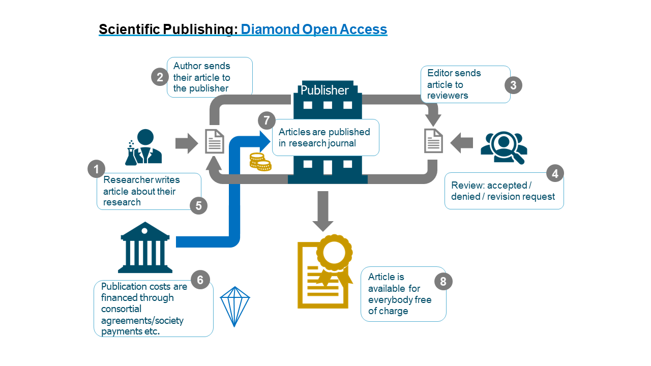 Gold open access refers to the publication of scholarly works in open access journals, as open access monographs, or as contributions to open access collections. As a rule, these works undergo the same quality-assurance process as closed access publications. Diamond open access is a subtype of gold open access that is financed without publication charges. Diamond open access publishing often has a community-driven, non-commercial background